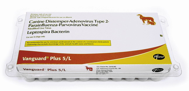 Vanguard Plus 5/L (Вангард Плюс 5/L) (Гана, Инфекциозен хепатит, Аденовирус тип 2, Параинфлуенца, Парвовироза и Лептоспироза) Живи модифицирани вируси плюс инактивирани лептоспири Описание Ваксината се състои от лиофилизирана компонента разположена в среда от инертен газ вместо под вакуум и течна компонента - лептоспирен бактерин, който съдържа инактивирани цели култури на L. canicola и L. icterohaemorragiae и служи за разтворител на лиофилизираната компонента. Показания Ваксината е предназначена за имунизация на здрави кучета, навършили 6 седмична възраст или по-големи, с цел предпазване от гана, причинена от СD вирус, инфекциозен хепатит причинен от аденовирус тип 1 (САV-1), респираторна болест причинена от аденовирус тип 2 (САV-2), параинфлуенца причинена от СРI вирус, парвовиросен ентерит причинен от СРV вирус и лептоспироза причинявана от L. canicola и L. Icterohaemorragiae. Упътвания 1.Общи упътвания: да се ваксинират само здрави обезпаразитени кученца. 2.Асептично разтворете лиофилизираната ваксина с течния бактерин, разклатете добре и приложете 1 мл подкожно или мускулно. 3. Препоръчителна схема на приложение - Първа ваксинация - на 6 седмична възраст - Втора ваксинация – на 9 седмична възраст - Трета ваксинация – на 12 седмична възраст или 3 ваксинални дози през З седмици. 4. Годишна реваксинация с по една доза. Внимание 1. Ваксината да се съхранява при температура 2-7’ С. Да не се замразява! По-дългото съхранение при по-висока температура или директна слънчева светлина може да повлияе върху качествата на биопродукта. 2. Да се използва цялото съдържание на флакона след отварянето му. 3. При работа да се използват сухи стерилни игли. 4. След употреба флаконите, както и останалото съдържание в тях да се изгорят. 5. Ваксината съдържа пеницилин и стрептомицин като консерванти. 6. Да не се ваксинират бременни животни. 7. Както и при другите ваксини, може да се появи анафилаксия. Препоръчва се употребата на епинефрин като антидот. 8. Ваксината е ефикасна само при здрави обезпаразитени животни. Защитен имунен отговор може да не се индуцира ако животните са опаразитени, стресирани, недохранени, инкубират инфекциозно заболяване и др. Срок на годност: 18 месеца Начин на отпускане: По лекарско предписание Предпазни мерки при унищожаване на неизползван ВМП: съгласно действащото законодателство на Р България Само за ветеринарномедицинско приложение! |